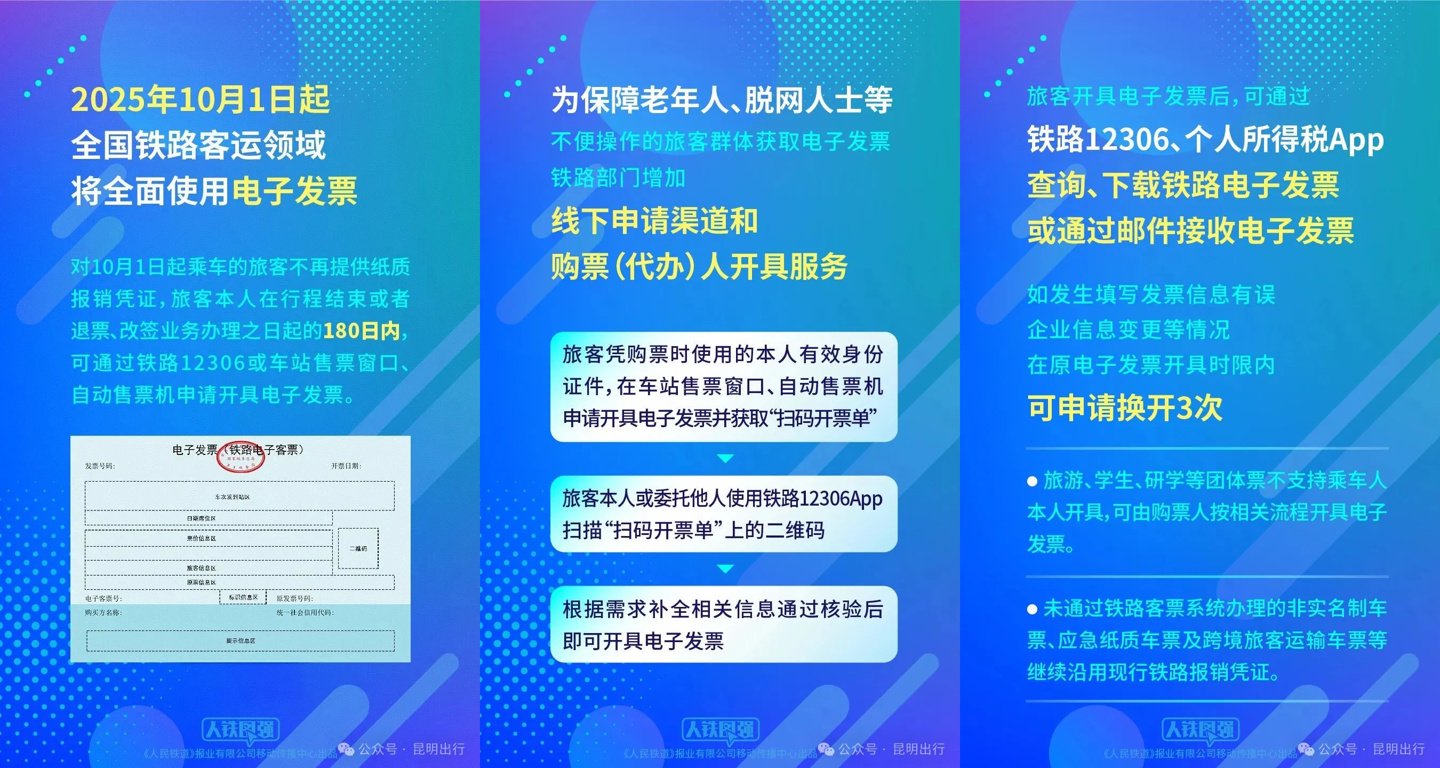具体来说,2025 年 10 月 1 日起全国铁路客运领域将全面使用电子发票,国铁对 10 月 1 日起乘车的旅客不再提供纸质报销凭证,旅客本人在行程结束或退票、改签业务办理之日的 180 日内,可通过铁路 12306 或车站售票窗口、自动售票机申请开具电子发票。后续可通过铁路 12306 / 个人所得税 App 查询、下载铁路电子发票或通过邮件接收电子发票。