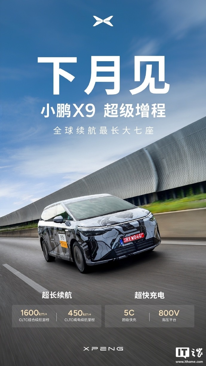 IT之家 9 月 15 日消息,小鹏汽车今日宣布,全球续航最长新能源大七座小鹏 X9 超级增程,即将下个月正式亮相。