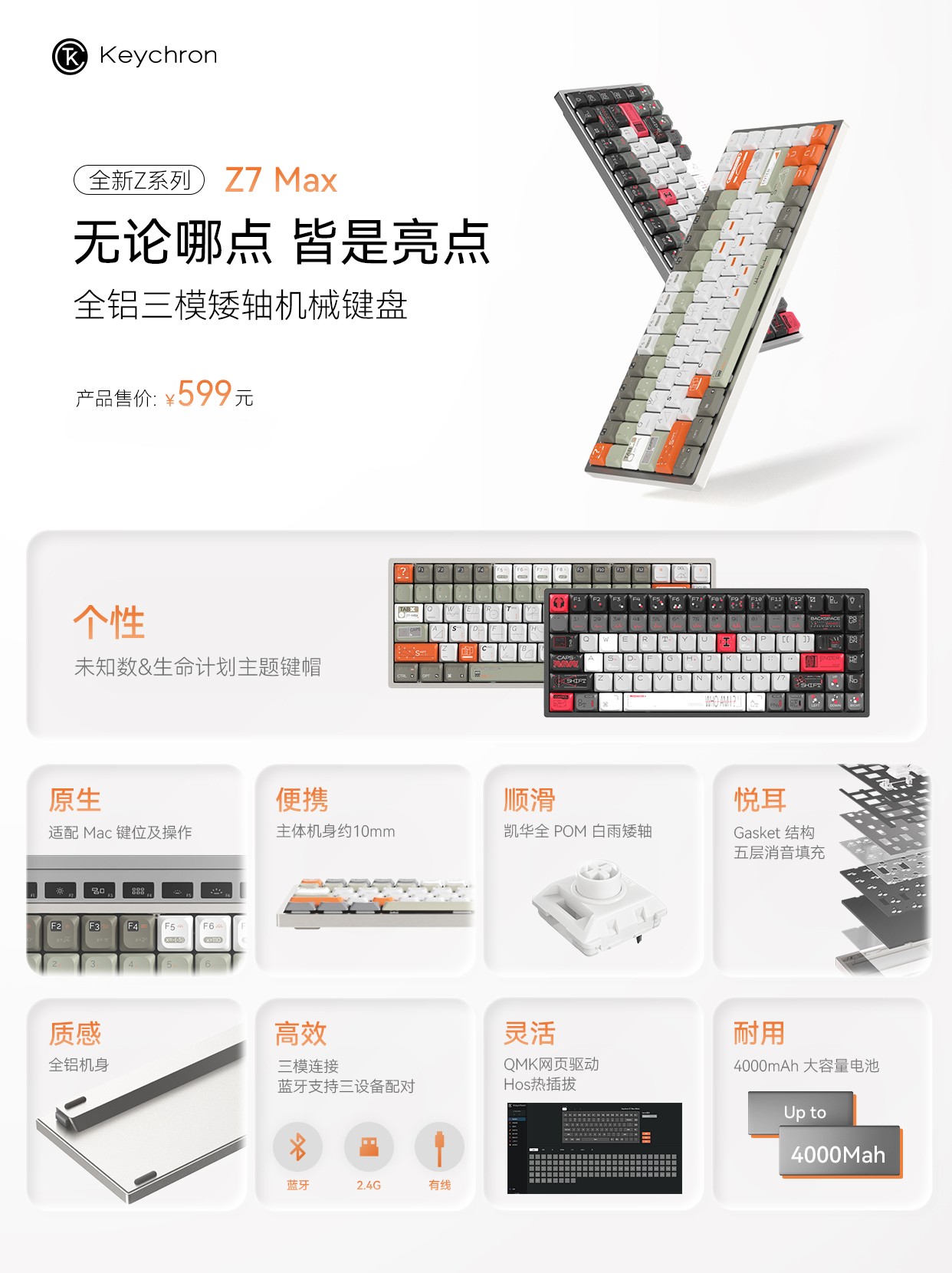 Kechron 官方表示 Z7 MAX 键盘产品售价为 599 元,不过电商平台的实际到手价格会更低。