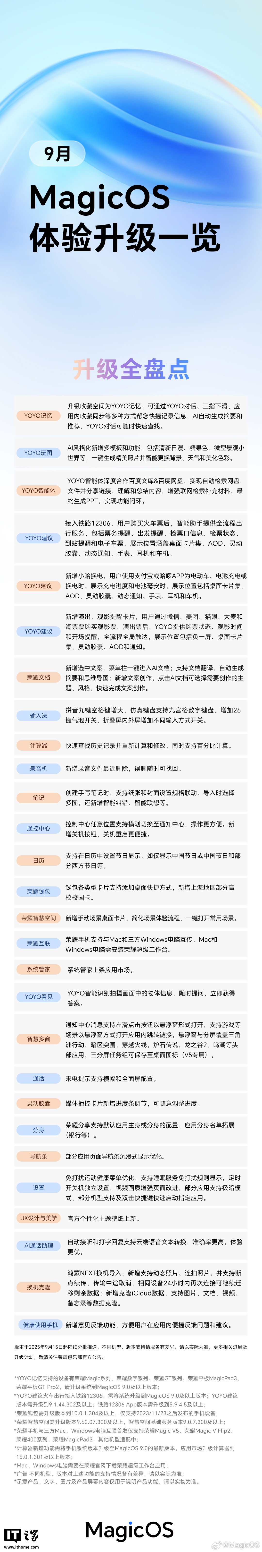 IT之家附荣耀 MagicOS 系统 9 月升级内容如下:
