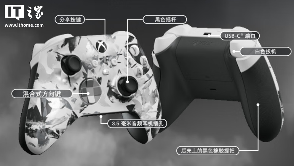 这款手柄采用经典的灰黑配色,正面外壳为白色不透明材质,搭配黑、灰色装饰图案,背部外壳为经典黑色,肩键、按键则采用纯黑色、白色。