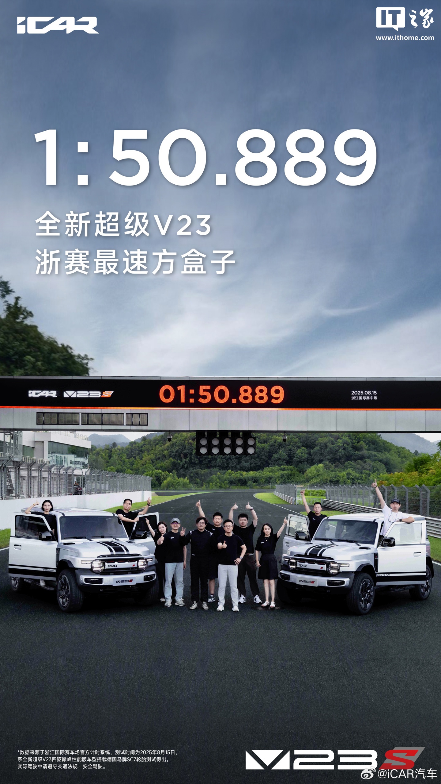 IT之家 9 月 15 日消息,今日奇瑞 iCAR 公布了 iCAR V23S(官方称之为全新超级 V23)的实车图和浙赛圈速成绩 ——01:50.889,成为“浙赛最速方盒子”。作为参考,浙赛 SUV 官方圈速第一的车型是莲花 ELETRE R+,成绩为 1 分 37 秒 792。