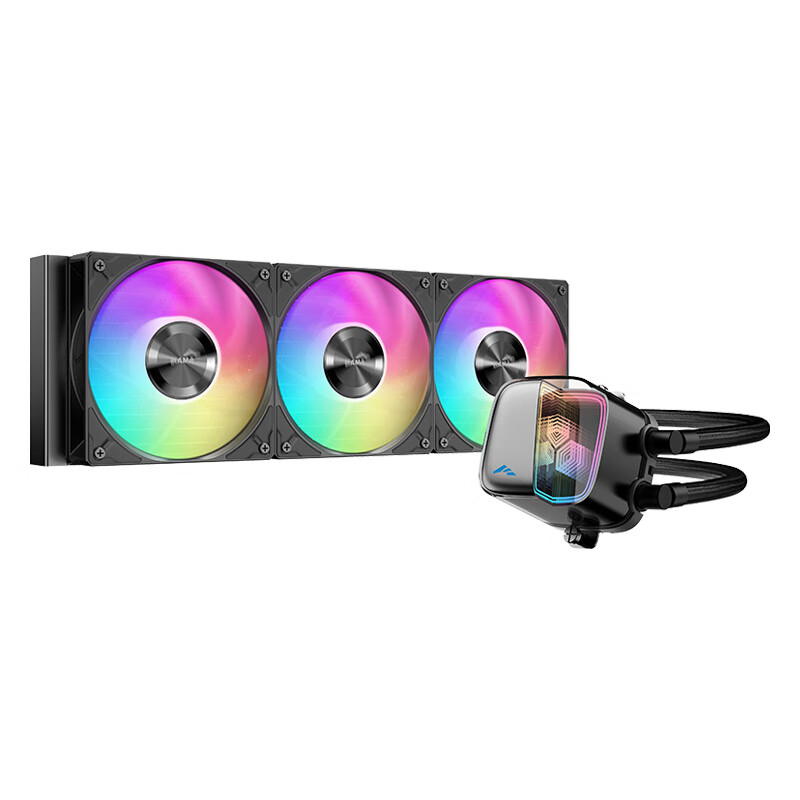 该散热器配备三把 ARGB 120mm 液压轴承风扇,通过可隐藏的定制线进行串联,官方标称最大风压可达 2.85mmH2O,最大风量可达 72.3CFM,最高转速为 2200±10% RPM。