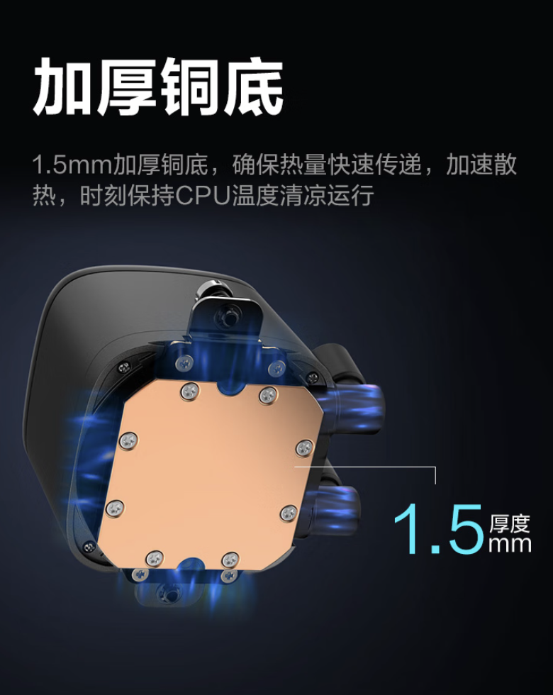 据介绍,这款散热器的冷头整体造型较为突出,与海景房机箱风格类似,官方称之为“赛博观景窗”。散热器匹配先马自研高性能陶瓷水泵,搭配大尺寸纯铜铜底。