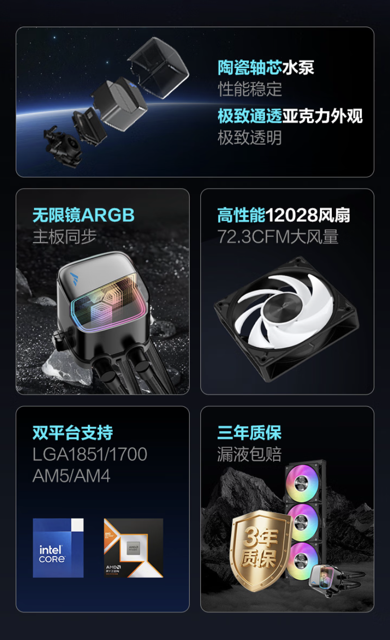 兼容性方面,该散热器支持英特尔 LGA 115X / 1200 / 1700 / 1851 及 AMD AM5 / AM4 平台,提供 3 年质保。
