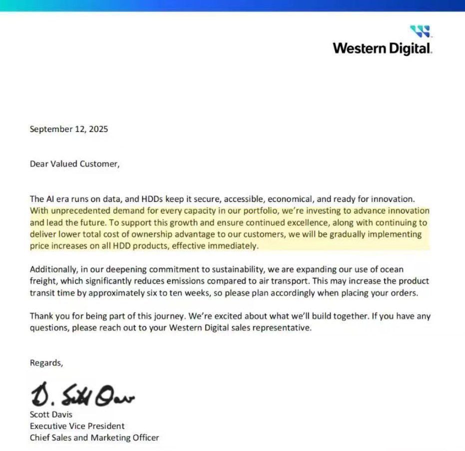 IT之家 9 月 16 日消息,根据网络流传的一封西部数据官方文件,这家存储巨头在本月 12 日向客户表示即日起将逐步上调所有机械硬盘产品价格。