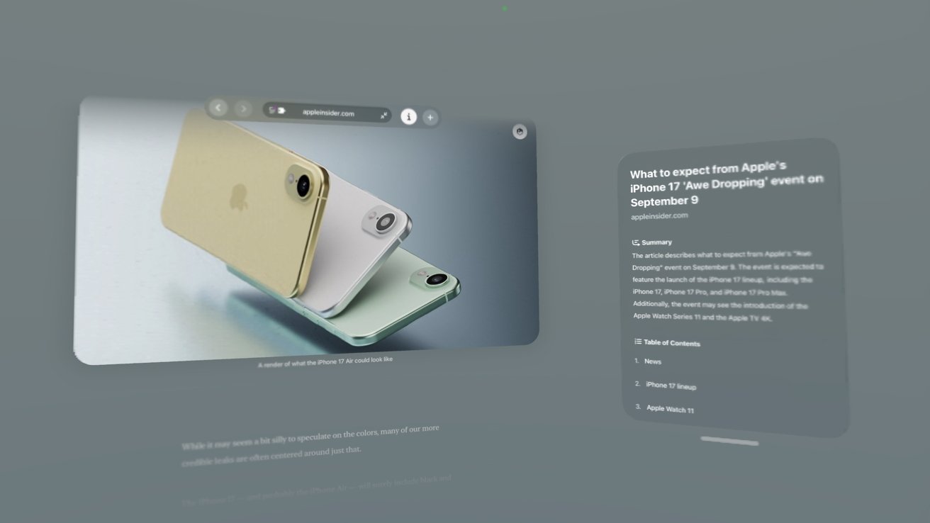 Safari 浏览器也迎来空间化升级,新增“空间浏览模式”,可将网页转化为沉浸式阅读环境,隐藏其他窗口,突出文字与自动空间化的图片。网站内嵌的 USDZ 格式 3D 对象可直接“提取”到现实空间中,方便用户近距离查看并按比例摆放。