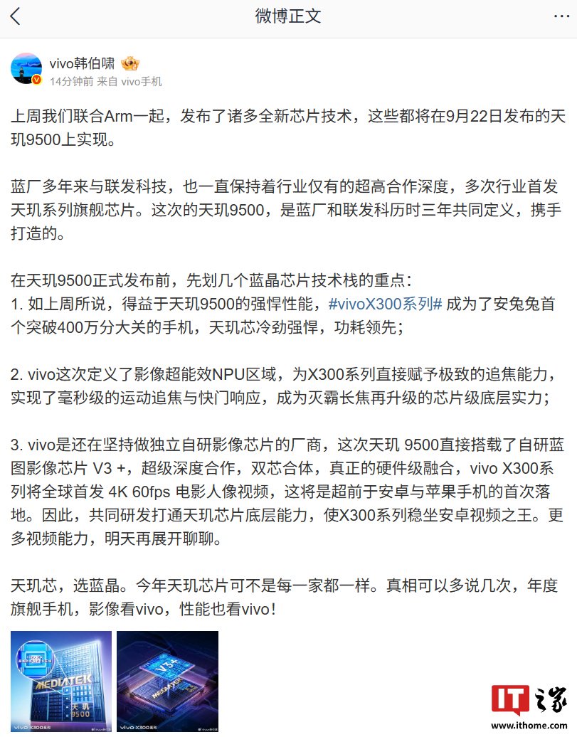 IT之家 9 月 16 日消息,vivo 通信科技有限公司产品经理韩伯啸今日发文预热 vivo X300 系列新机,并透露了天玑 9500 处理器蓝晶芯片技术栈的部分亮点信息。