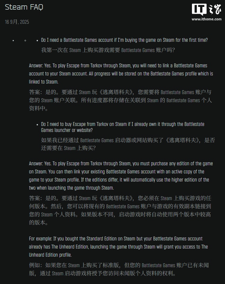 昨日,Battlestate 发布了一段 Steam FAQ 常见问题的答案。其中提到,要想在 Steam 上游玩《逃离塔科夫》,玩家还需要将 Battlestate Games 账户与 Steam 账户关联。