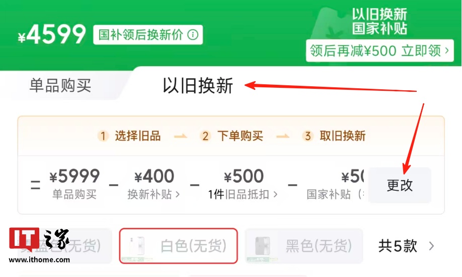 无货情况下同样支持完成换新估值,点击宝贝售价下方“以旧换新” → 下方“更改”按钮,即可完成:
