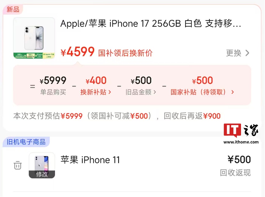 iPhone 17 256GB 定价 5999 元(国补后 5499 元),目前以旧换新至高补贴 400 元,折合仅需 5099 元 + 支持白条 12 期免息(24 期免息需 20:00 抢)。