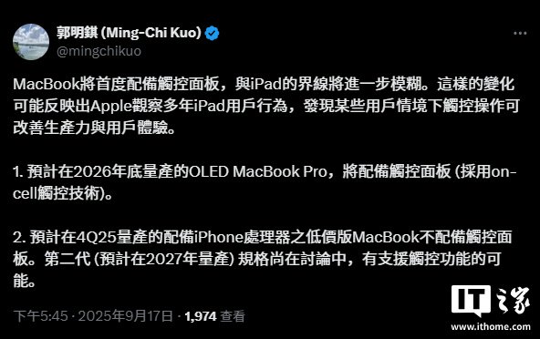 IT之家 9 月 17 日消息,分析师郭明錤今日表示,MacBook 将首度配备触控面板,与 iPad 的界线将进一步模糊。这样的变化可能反映出苹果观察多年 iPad 用户行为,发现某些用户情境下触控操作可改善生产力与用户体验。