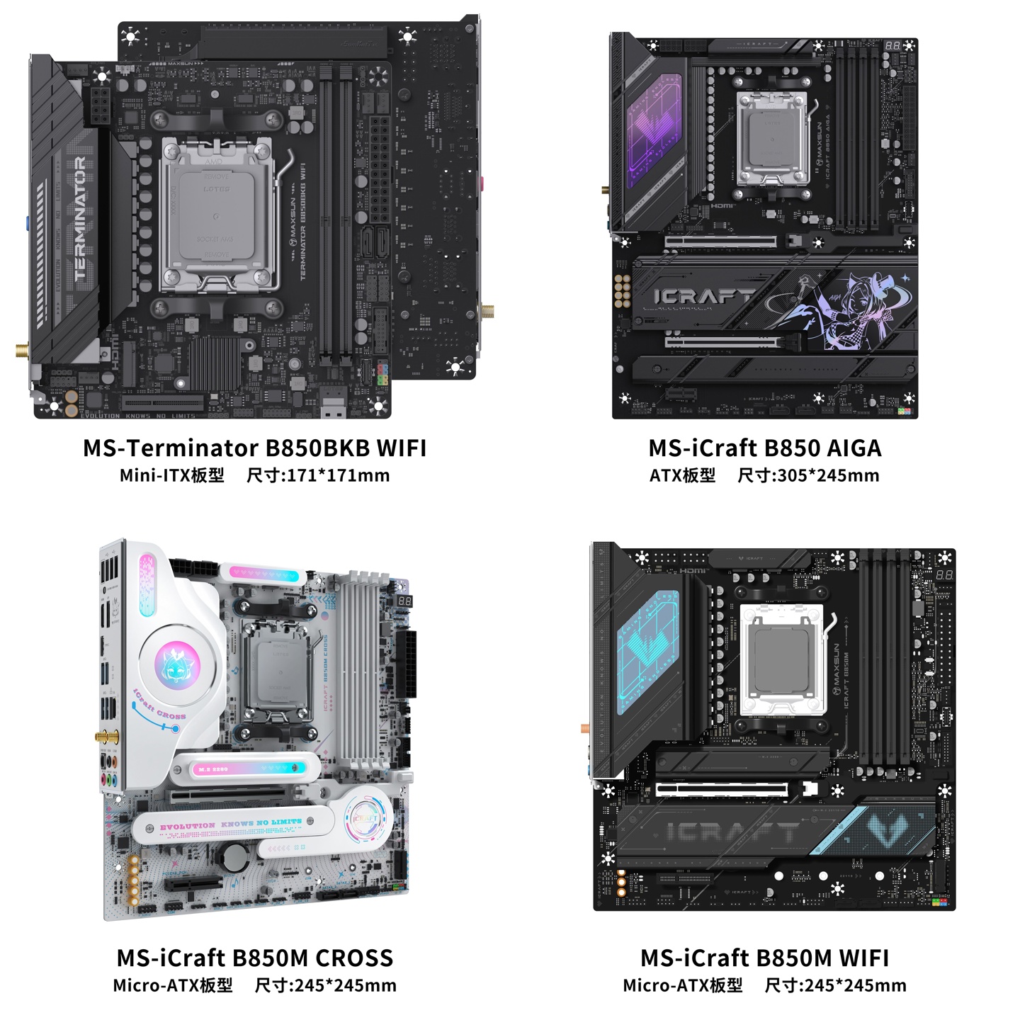 IT之家 9 月 17 日消息,铭瑄 MAXSUN 昨日公布了由四个型号组成的 AMD B850 主板新品方阵,包含 AMD 阵营首款 BKB 板型主板终结者 B850BKB WIFI、铭瑄首款 B850 ATX“大板”电竞之心 iCraft B850 AIGI 瑷珈等款式。