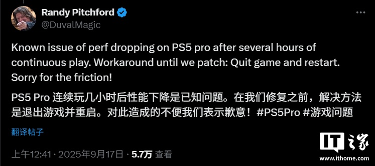 《无主之地 4》开发商 Gearbox 的开发主管 Randy Pitchford 今日回应称,PS5 Pro 连续玩几个小时《无主之地 4》后性能下降是已知问题。在官方修复之前,临时解决方法是退出游戏并重启。