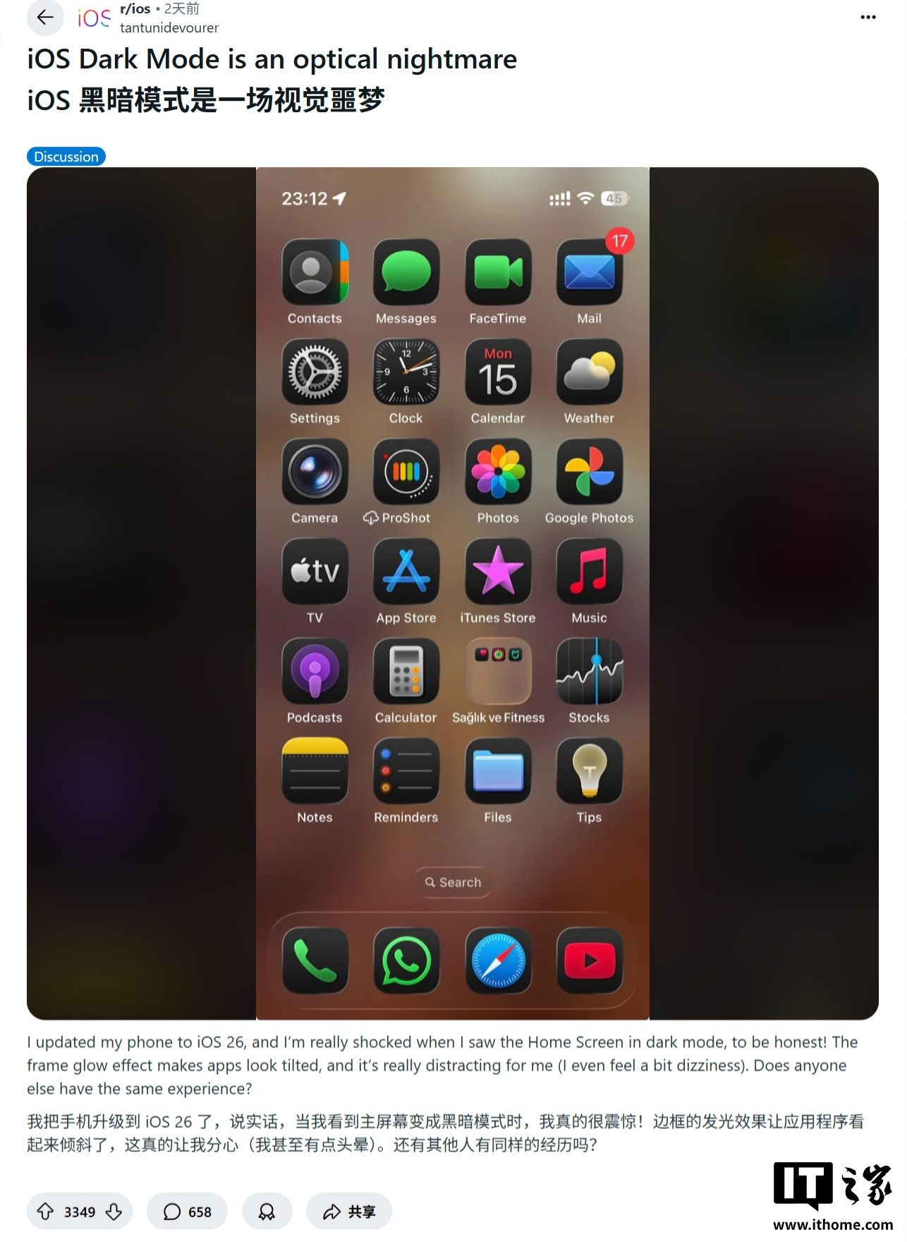 不过部分用户反馈,使用 iOS 26 时出现了图标似乎倾斜的视觉错觉,有人甚至因此感到头晕或方向感紊乱。相关讨论在 Reddit 上迅速发酵,有条帖子直言“整个 iOS 26 都是视觉噩梦”,在IT之家发稿前,获得超过 3000 个点赞。