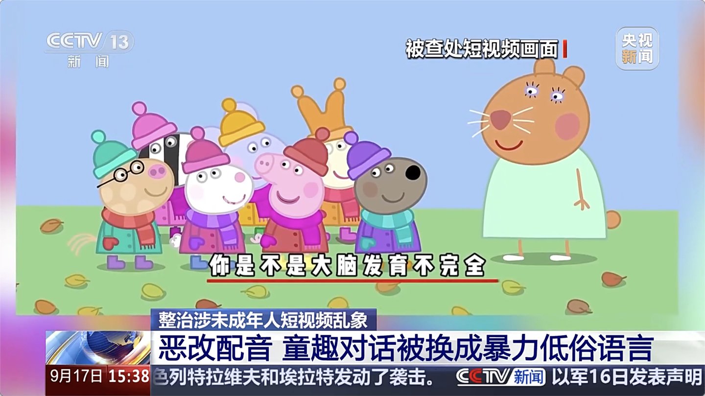 《小猪佩奇》等动画片遭恶改,童趣对话被篡改为暴力低俗语言,传播不良信息;
