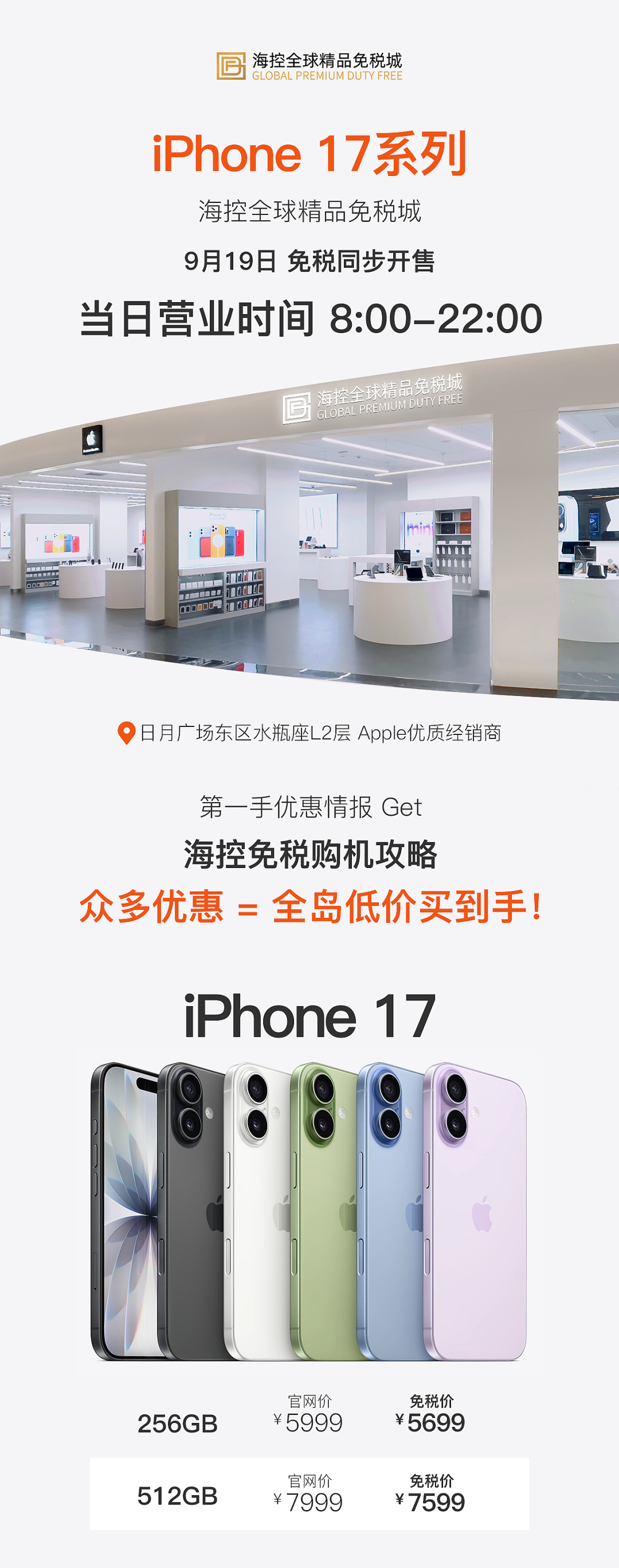 IT之家 9 月 18 日消息,苹果 iPhone 17/Pro 系列手机将于 9 月 19 日正式发售,据海控全球精品免税城官方今日消息,iPhone 17 / Pro 系列将在海南免税商店同步开售。