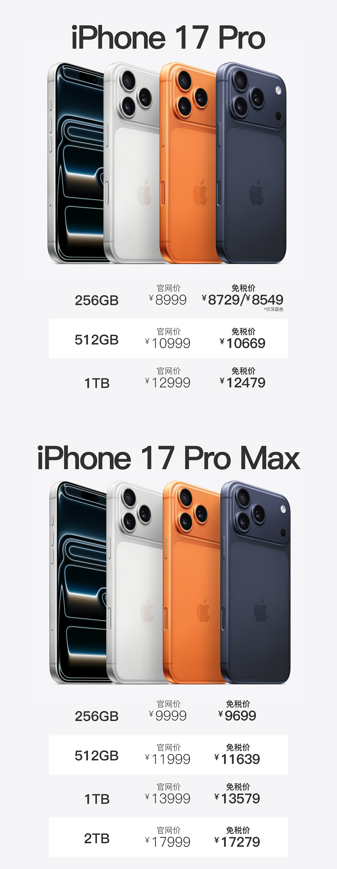 256GB 官网价 8999 元,免税价 8729 元 / 8549 元(仅深蓝色)