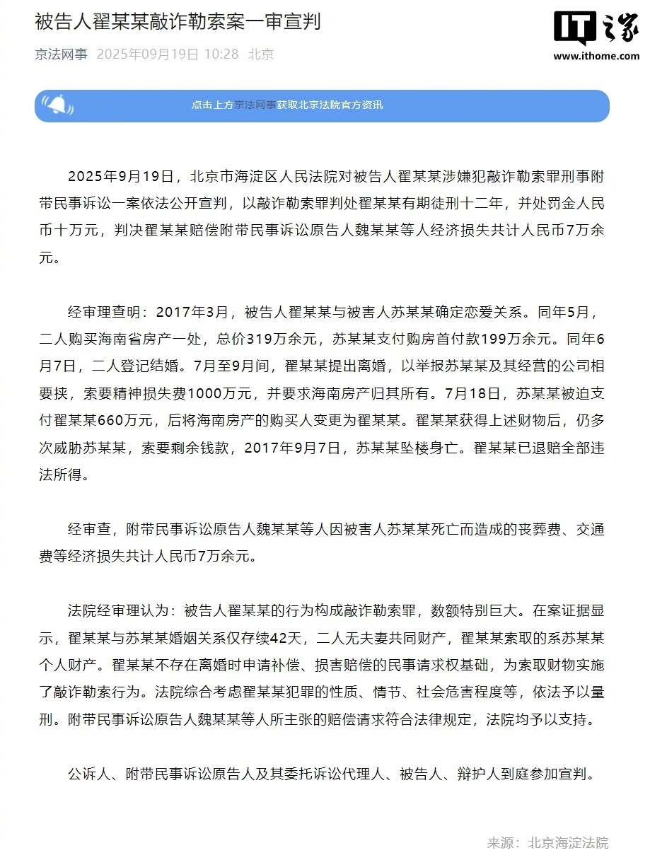 IT之家 9 月 19 日消息,“京法网事”公众号今天发布博文,报道称 2025 年 9 月 19 日,北京市海淀区人民法院对被告人翟某某涉嫌犯敲诈勒索罪刑事附带民事诉讼一案依法公开宣判,以敲诈勒索罪判处翟某某有期徒刑十二年,并处罚金人民币十万元,判决翟某某赔偿附带民事诉讼原告人魏某某等人经济损失共计人民币 7 万余元。