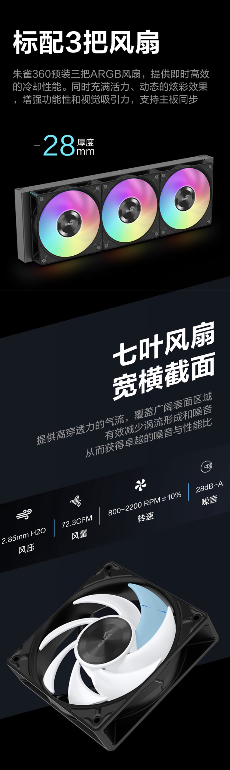 该散热器配备三把 ARGB 120mm 液压轴承风扇,通过可隐藏的定制线进行串联,官方标称最大风压可达 2.85mmH2O,最大风量可达 72.3CFM,最高转速为 2200±10% RPM。