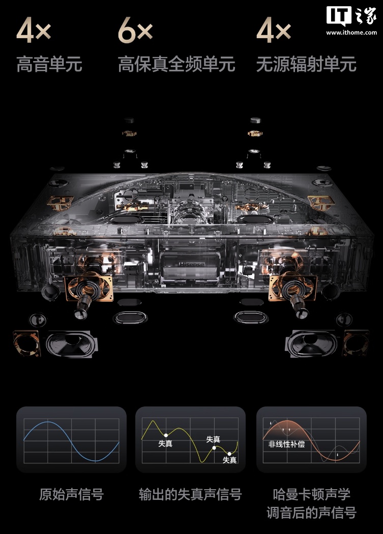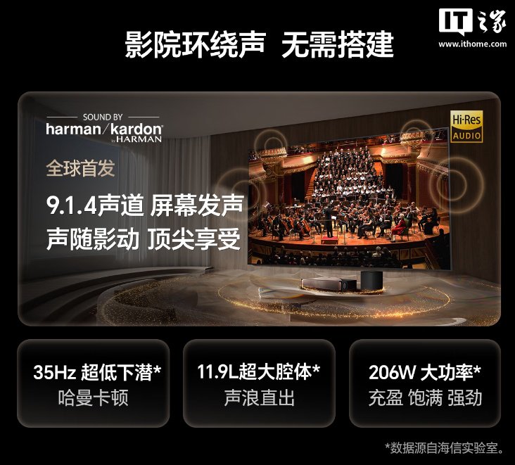 此外,该电视搭载行业首个 9.1.4 声道屏幕发声技术,由屏幕发声、哈曼主机音响以及无线独立低音炮组成空间融合声场,支持 206W 功率、哈曼卡顿 35Hz 下潜。