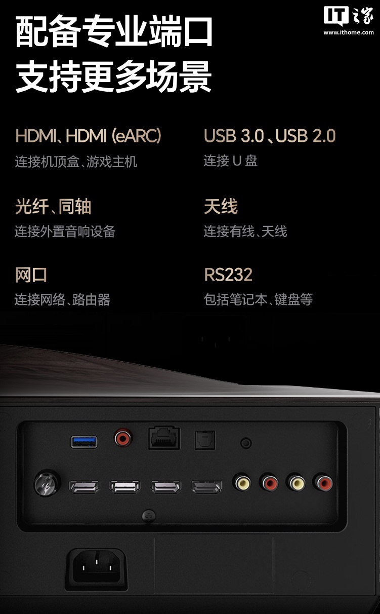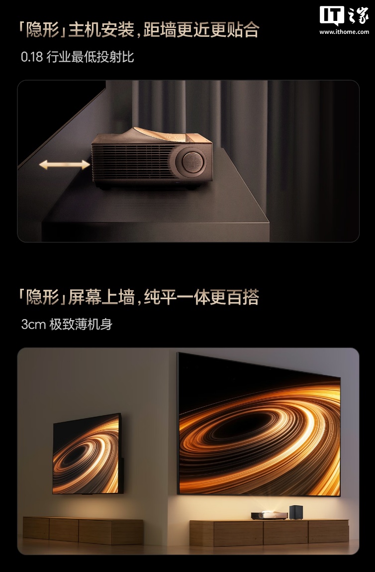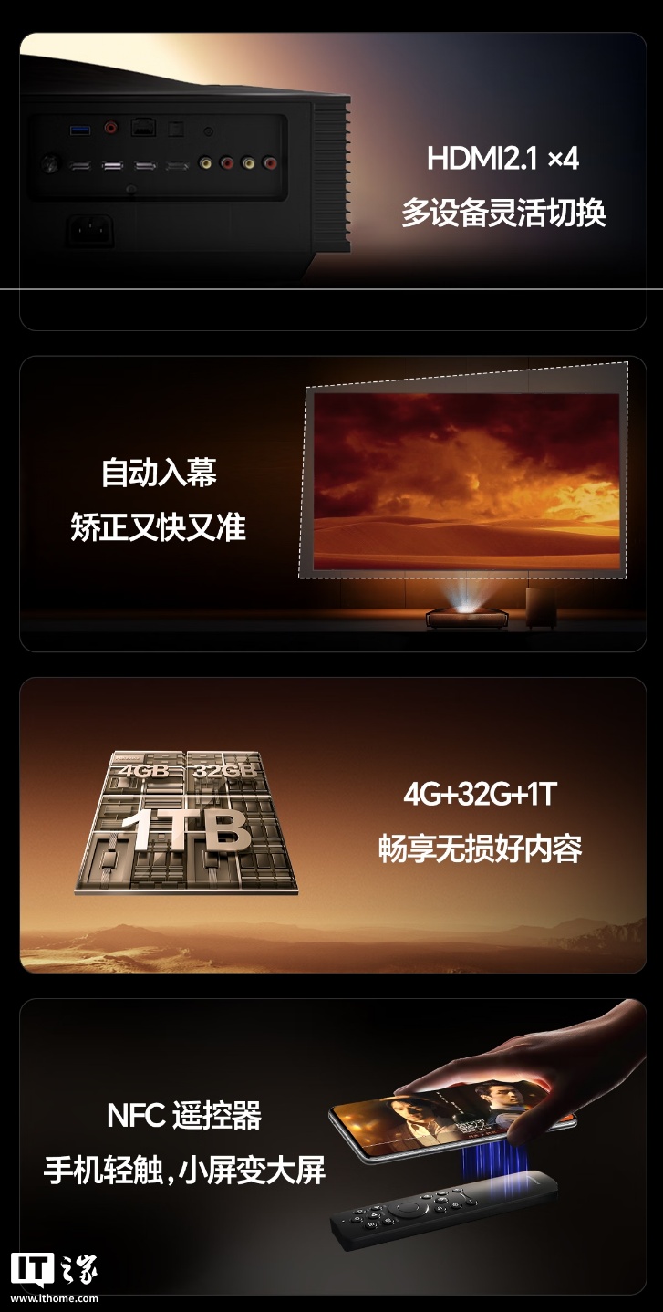 海信探索 X1 Ultra 支持 0.18“行业最低”投射比,屏幕 3cm 厚度贴墙,支持 Wi-Fi 7、DeepSeek 智能体,配有联发科 MT9655 芯片、4GB + 1TB 存储、4 个 HDMI 2.1 接口、NFC 遥控器。
