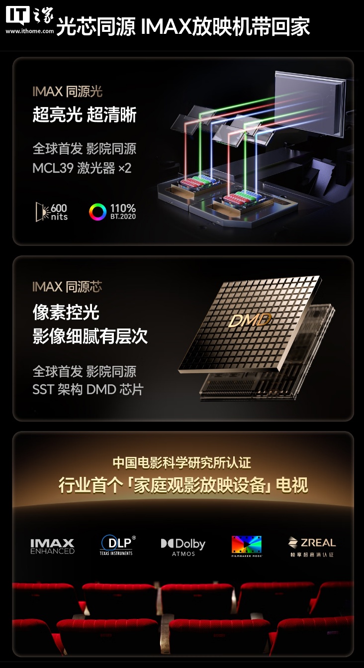 海信探索 X1 Ultra 全球首发影院同源 MCL39 激光器 ×2、影院同源 SST 架构 DMD 芯片,还是中国电影科学研究所认证的行业首个「家庭观影放映设备」电视。