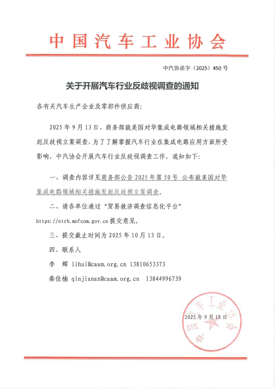 IT之家 9 月 19 日消息,中国汽车工业协会发布关于开展汽车行业反歧视调查的通知,通知称,各有关汽车生产企业及零部件供应商:2025 年 9 月 13 日,商务部就美国对华集成电路领域相关措施发起反歧视立案调查,为了了解掌握汽车行业在集成电路应用方面所受影响,中汽协会开展汽车行业反歧视调查工作。