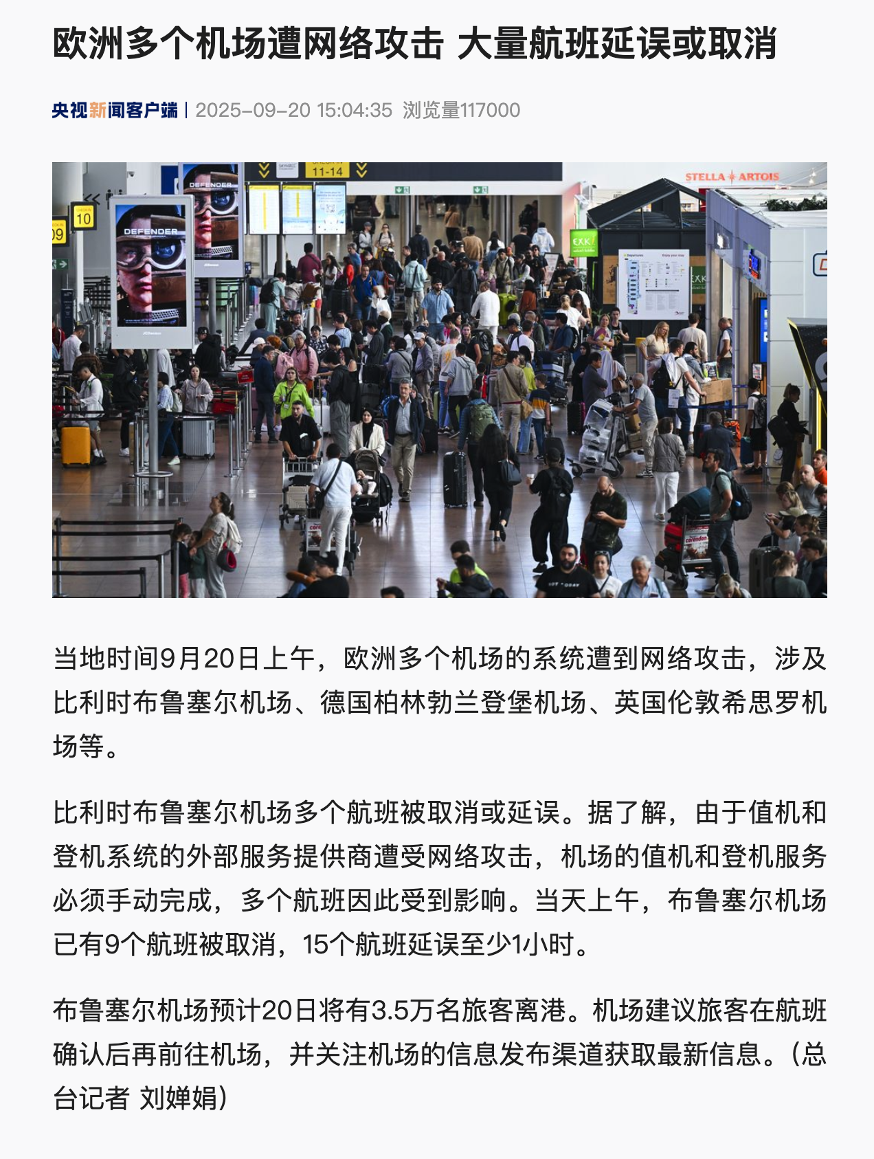 IT之家 9 月 20 日消息,据央视新闻,当地时间 9 月 20 日上午,欧洲多个机场的系统遭到网络攻击,涉及比利时布鲁塞尔机场、德国柏林勃兰登堡机场、英国伦敦希思罗机场等。