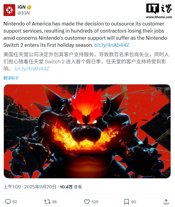 IT之家 9 月 21 日消息,据 IGN 昨日报道,任天堂美国公司决定将其客户支持业务外包至阿根廷、巴西和尼加拉瓜等南美国家,导致约 200 名在美国长期从事合同工作的客服人员失业。