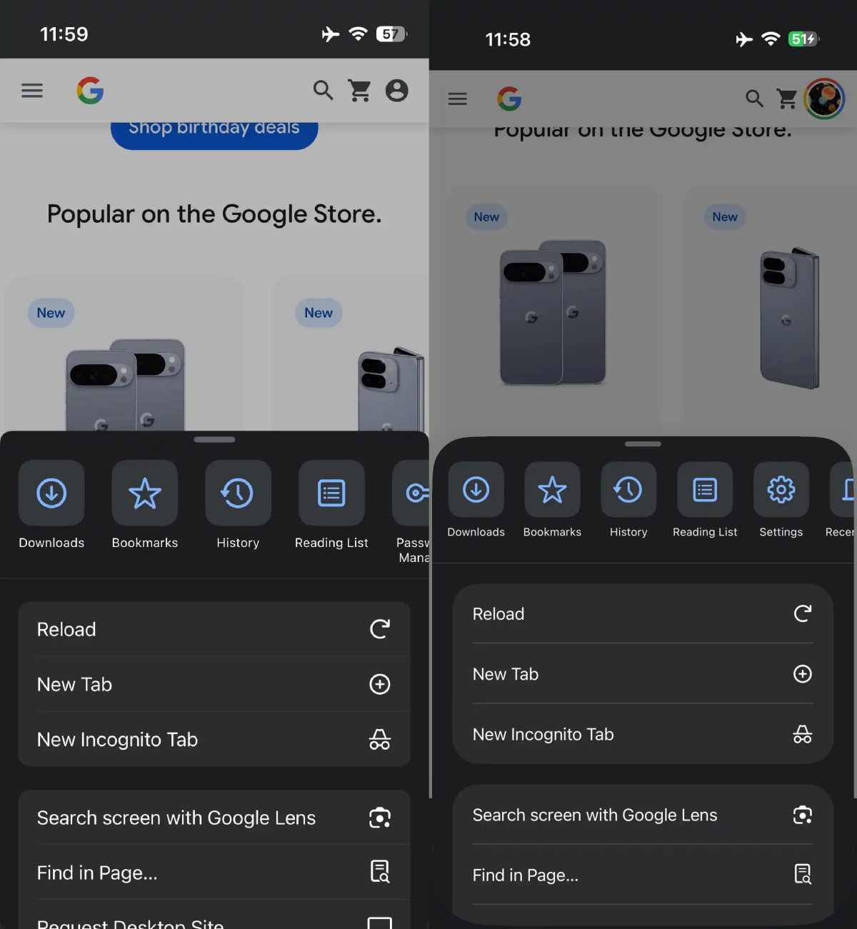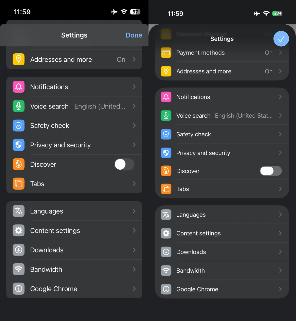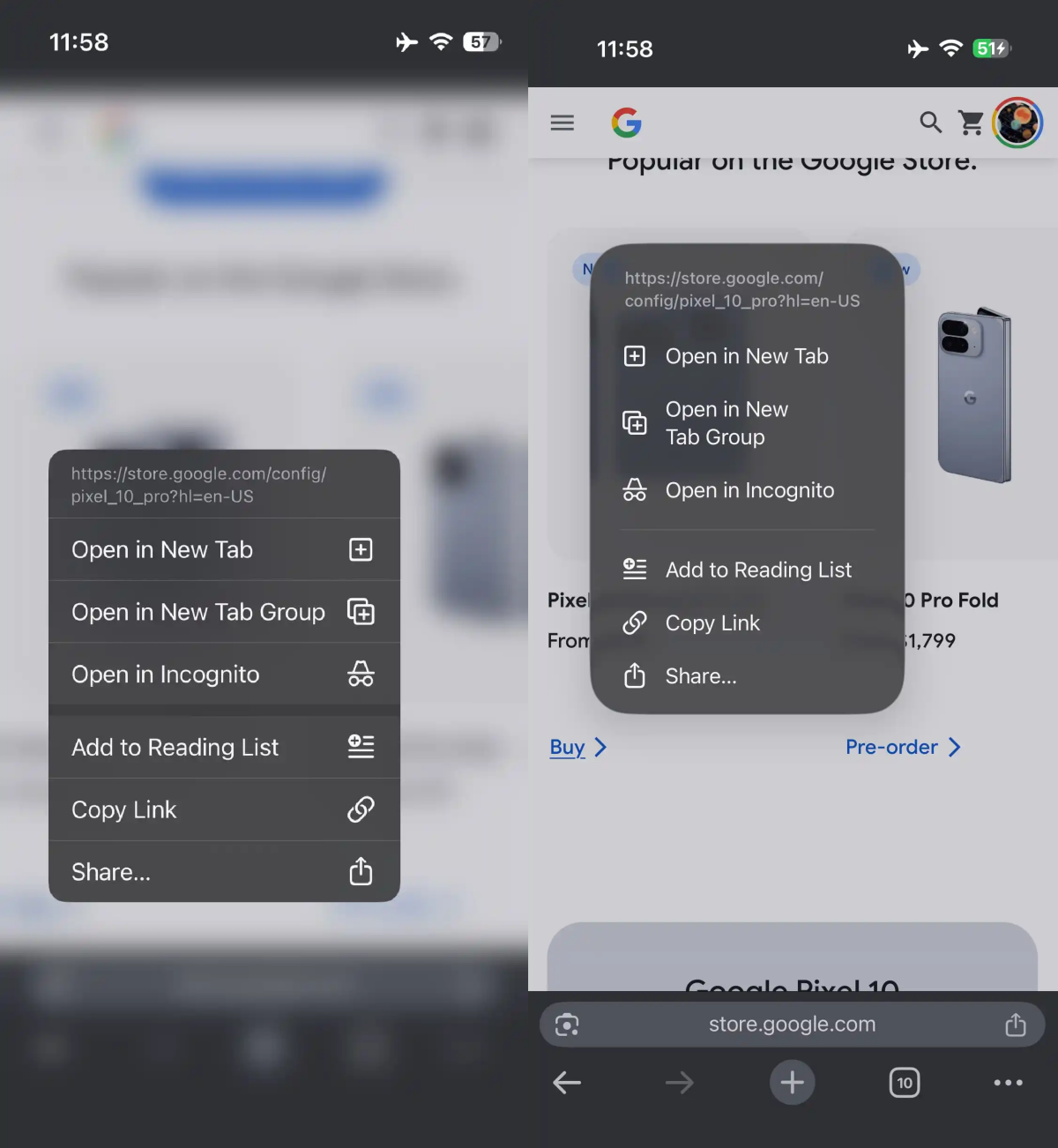 与安卓版相比,iOS 版本的界面和交互方式存在明显差异(例如 Chrome 在 2023 年 10 月新增底部地址栏,而安卓版则在 2025 年 7 月才引入),并且拥有独特的标签页网格视图和底部弹出菜单。