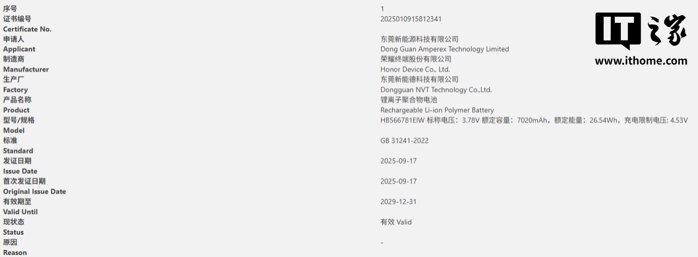 IT之家 9 月 21 日消息,荣耀旗下有一款 7020mAh(额定容量)的锂电池于周三通过了 3C 认证,额定能量 26.54Wh,充电电压限制为 4.53V。