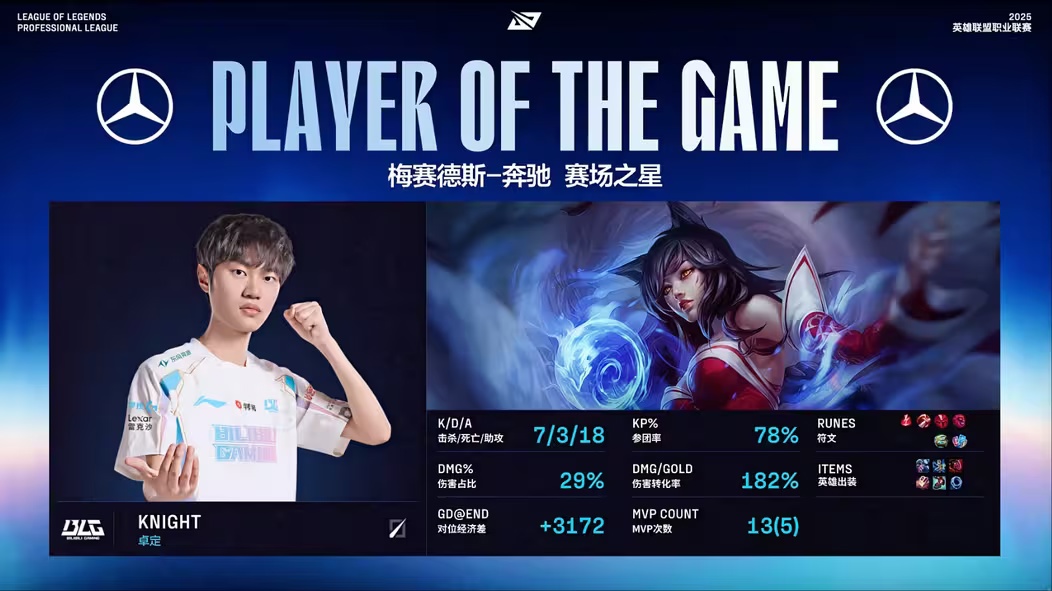 开局 4 分钟,BLG 下路组合力击杀泰坦,拿到一血。与此同时,Knight 阿狸支援野区,E 技能接连命中对手,BLG 打出零换三。