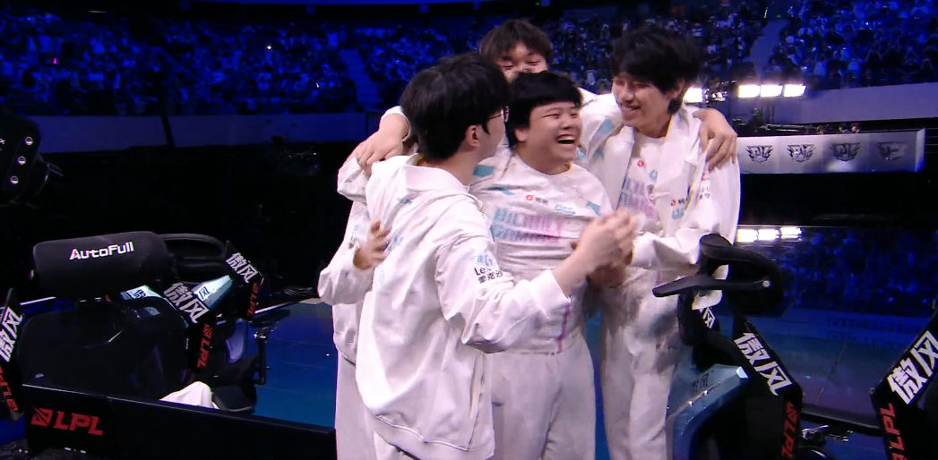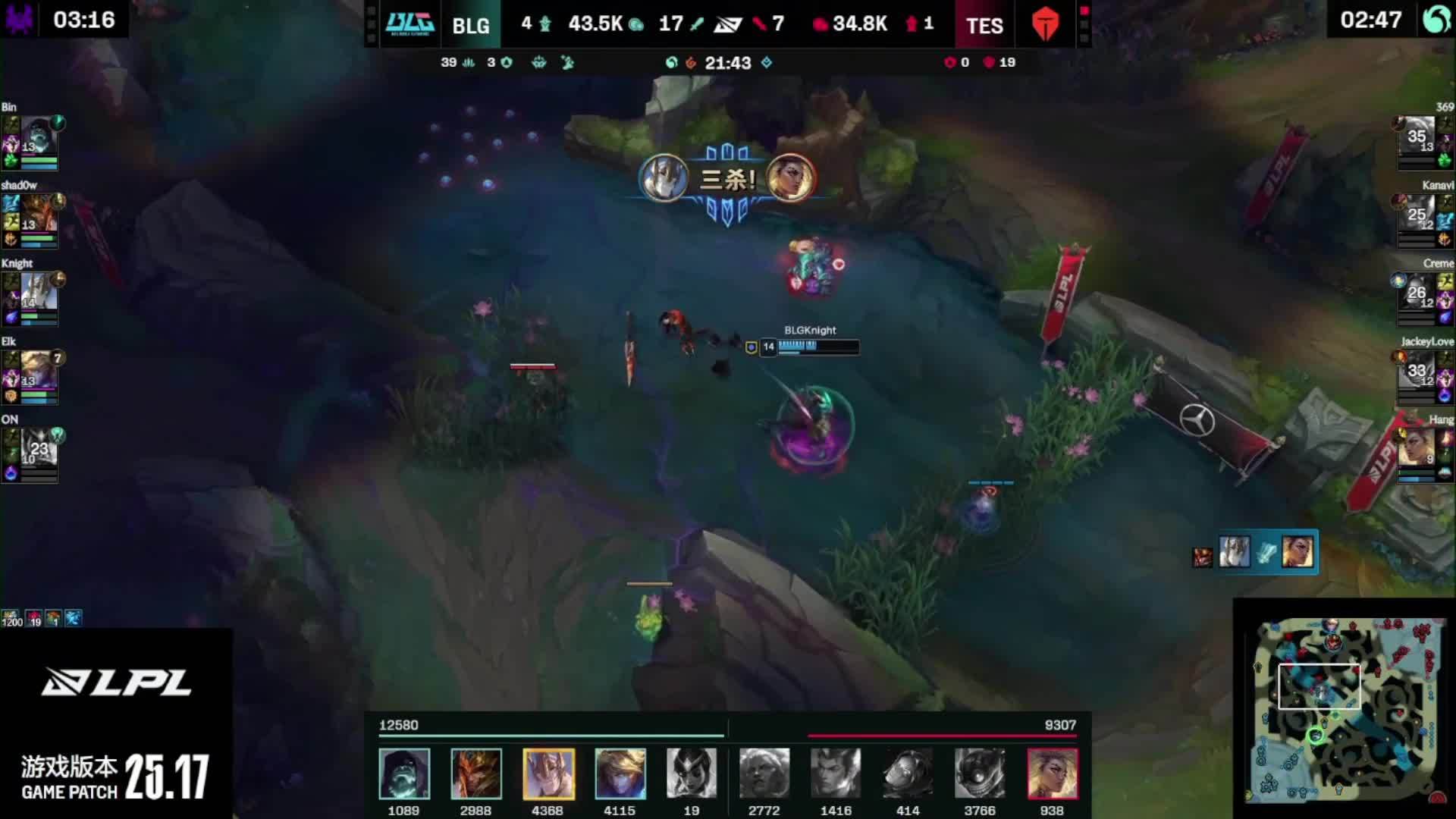 24 分钟,shad0w 皇子三进三出丝血逃生,BLG 众人集结后展开追击,Knight 加里奥究极绕后留住三人,最终 BLG 完成零换五。