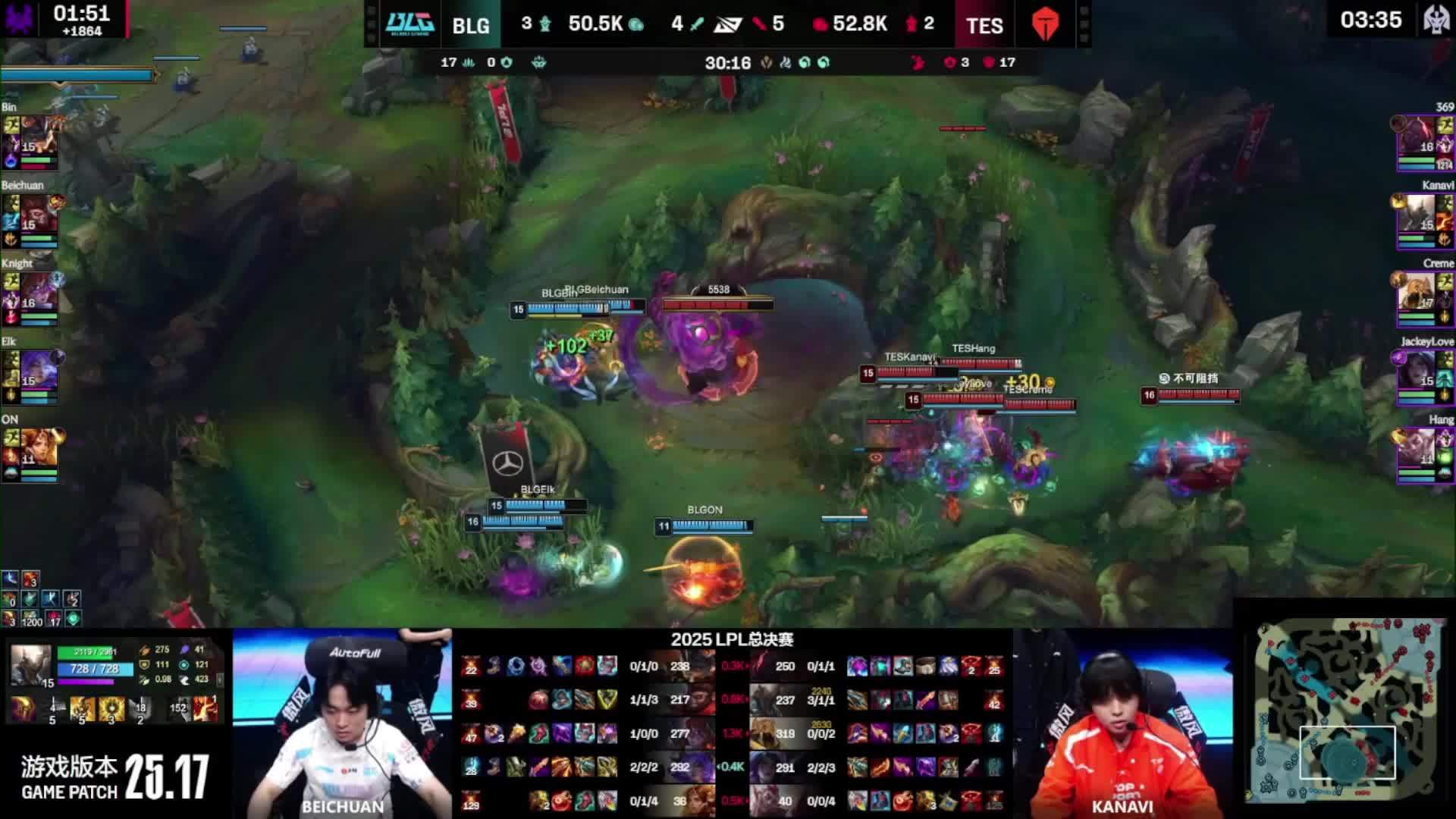 28 分钟,BLG 试图集火韦鲁斯,Hang 布隆大招击飞两人,Creme 瑞兹持续输出斩获三杀,TES 完成二换四,随后一波推进,拆掉水晶,再拿一分!