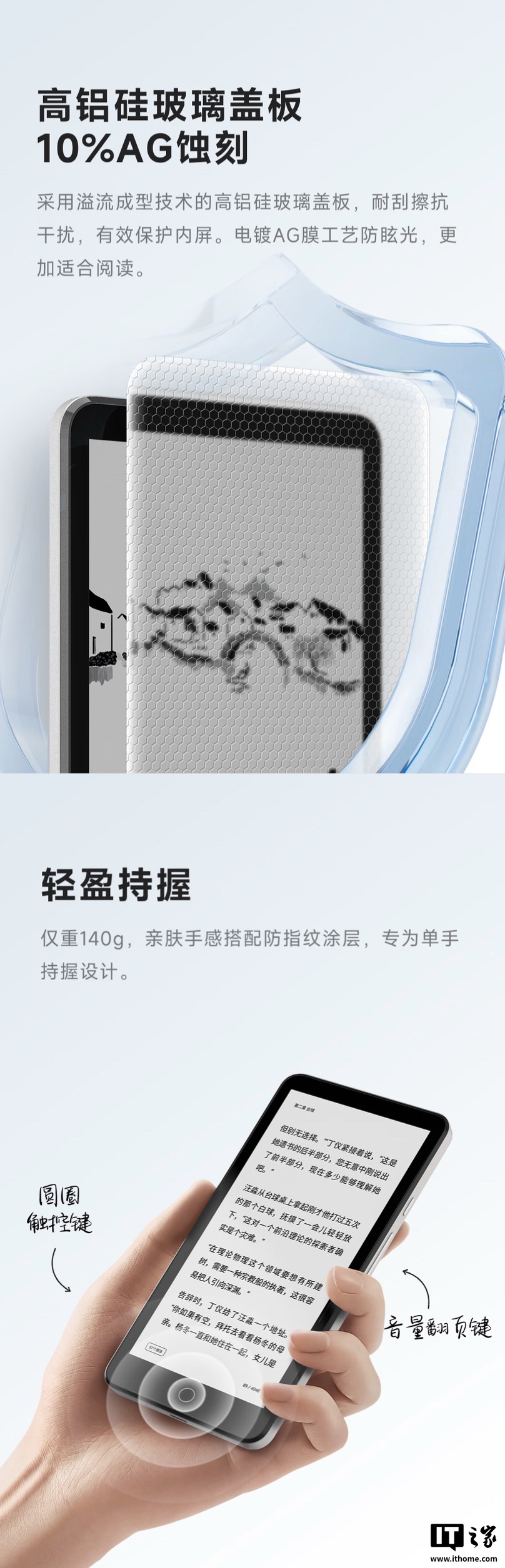 据介绍,该机整体厚度 6.9 毫米,重量 140 克,配备一块 5.84 英寸黑白墨水屏,(支持 256 级灰阶显示)外覆 10% AG 蚀刻高铝硅玻璃盖板,提供 32 级双色温冷暖阅读灯。