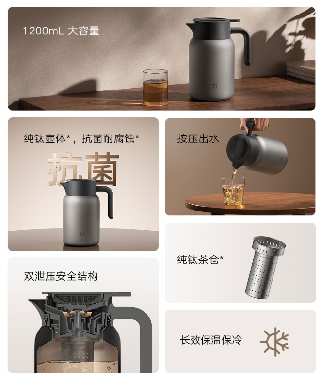 据介绍,这款产品具有 1200mL 容量,采用纯钛壶体(IT之家注:包含壶体内胆与壶体外壳,不包含产品顶部壶盖、出水口座、把手等部件),钛纯度 >99%。钛材质具有天然抗菌特性,能够有效延缓有害细菌的滋生。茶叶、花果等皆可充分浸润,内置 TA1 纯钛茶仓,有效隔离茶叶茶渣。