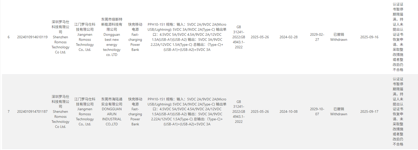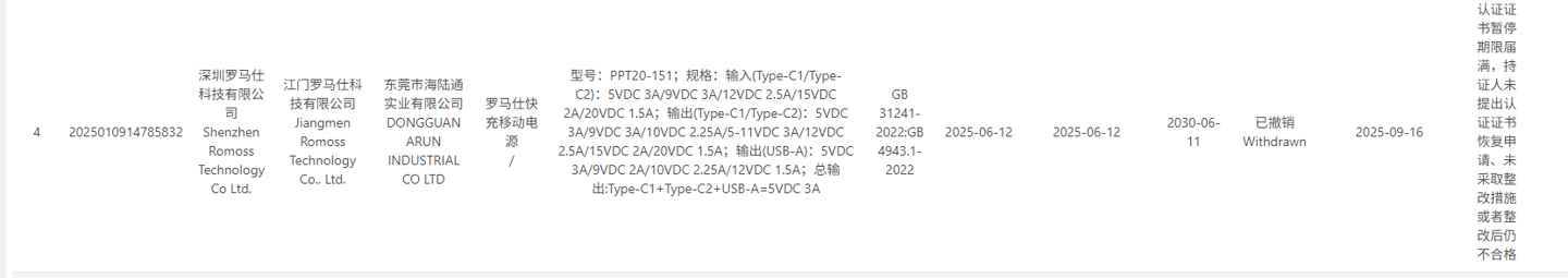 IT之家查询中国质量认证中心官网获悉,9 月 16 日和 17 日,深圳罗马仕科技有限公司的多个快充移动电源类产品 3C 认证证书被撤销,原因是“认证证书暂停期限届满,持证人未提出认证证书恢复申请、未采取整改措施或者整改后仍不合格”。