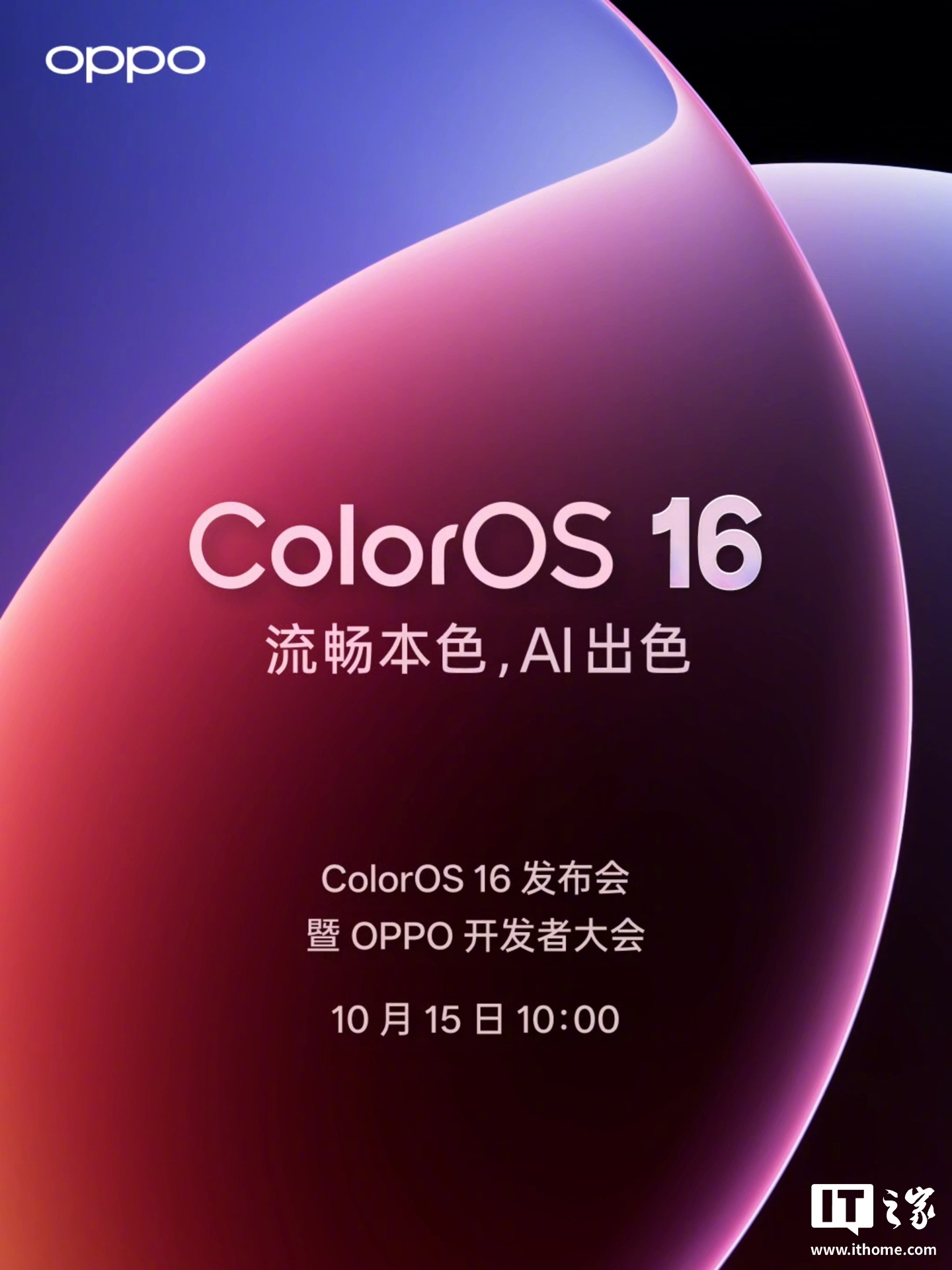 IT之家 9 月 22 日消息,OPPO ColorOS 官方今日宣布,全新系统 ColorOS 16 将于 10 月 15 日发布,号称“流畅本色,AI 出色”。