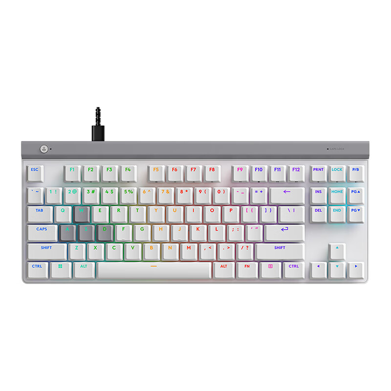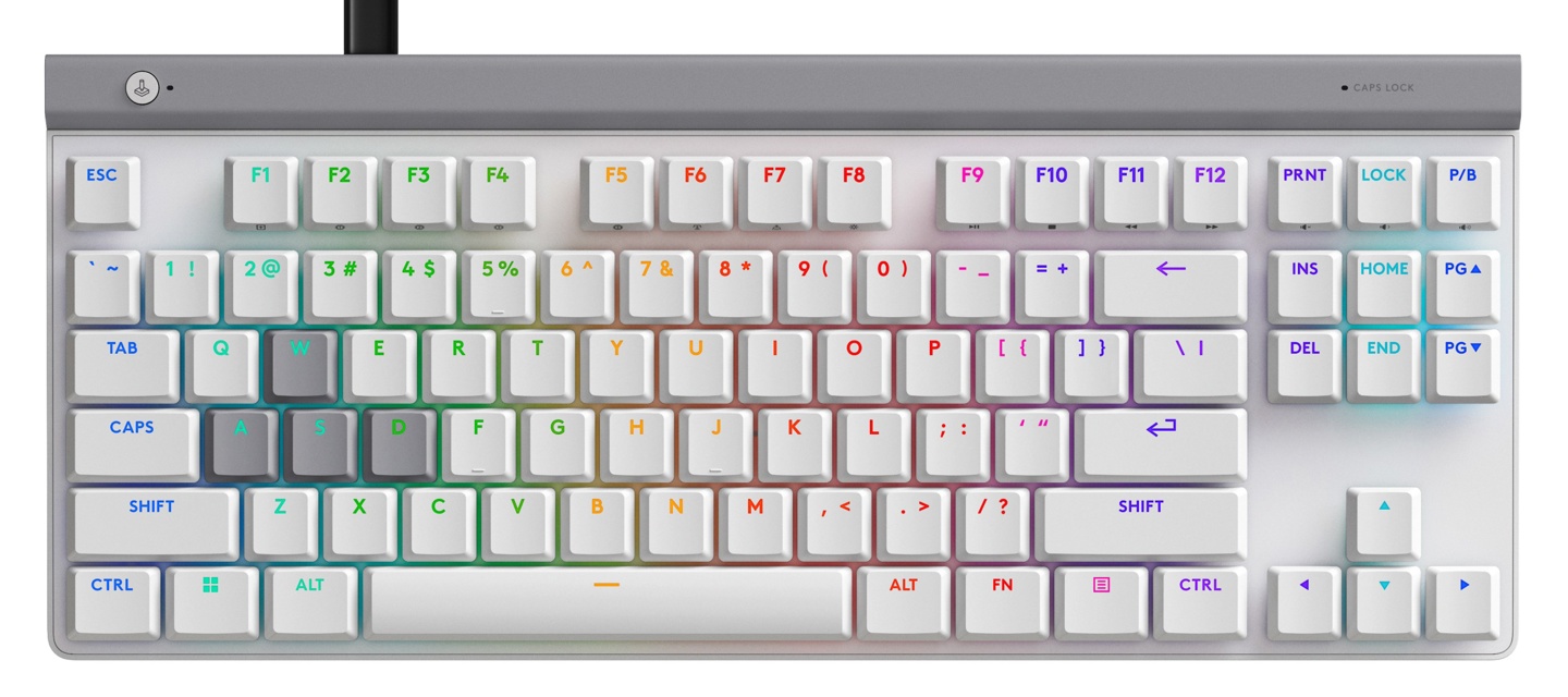 G515 RAPID TKL 采用 Fn 区分离的无数字小键盘配列设计,含键帽高度仅 22mm,配备不锈钢顶板和隔音层,支持沉浸式 LIGHTSYNC RGB 灯光效果。