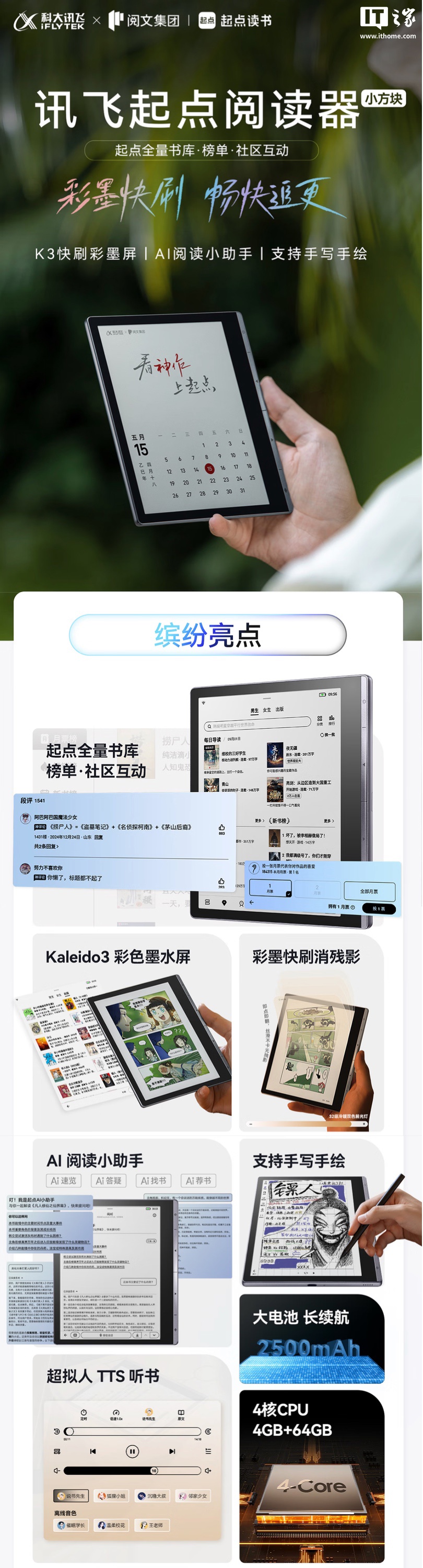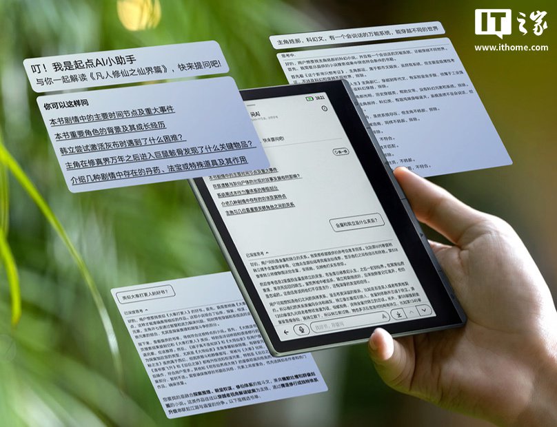 IT之家 9 月 22 日消息,由科大讯飞、阅文集团、起点读书联合定制的讯飞起点阅读器将于今天晚上 8 点在京东开售,该机配备一块 7 英寸 Kaleido 3 彩色墨水屏面板,定价为 1299 元,券后首发价 1219 元。