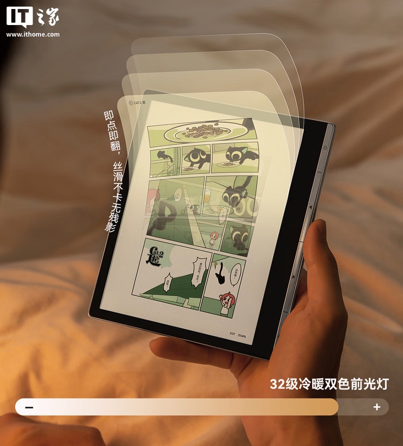 该机整体造型简洁,厚度 6.5 mm,重量 200g,正面配备一块 7 英寸 1680x1264 分辨率 Kaleido 3 彩色墨水屏面板,支持 4096 级压感主动式手写笔(需要另购),内置 IFR 快刷算法,提供 32 级冷暖双色前光灯。机身配备 AI 按键,一键可开启大模型阅读助手,支持总结提炼文章核心、速览全文、答疑解惑、精准找书荐书。