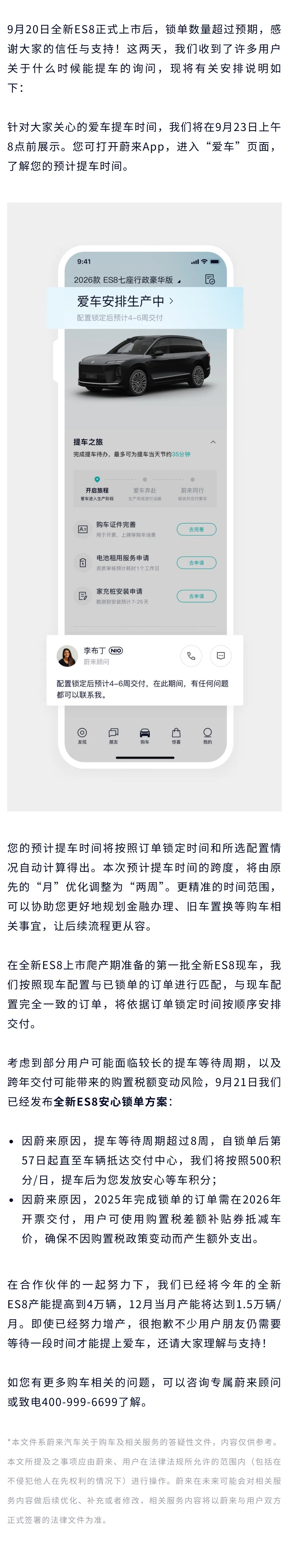 蔚来称,9 月 20 日全新 ES8 正式上市后,锁单数量超过预期。针对大家关心的爱车提车时间,蔚来将在 9 月 23 日上午 8 点前展示。用户可打开蔚来 App,进入“爱车”页面,了解预计提车时间。