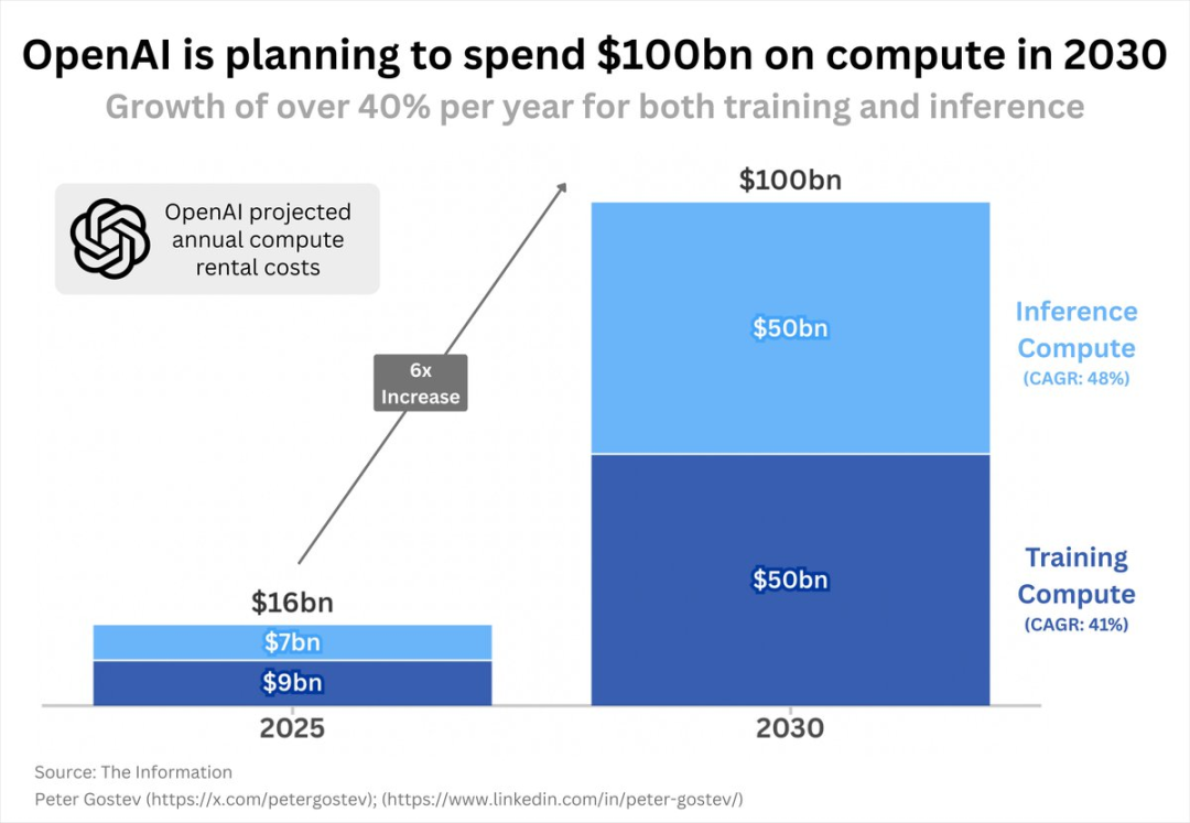 就从今年的数据来看,花的 160 亿美元中,计算成本为 90 亿美元,推理成本 70 亿美元,到了 2030 年,这两项投入都将接近 500 亿美元。