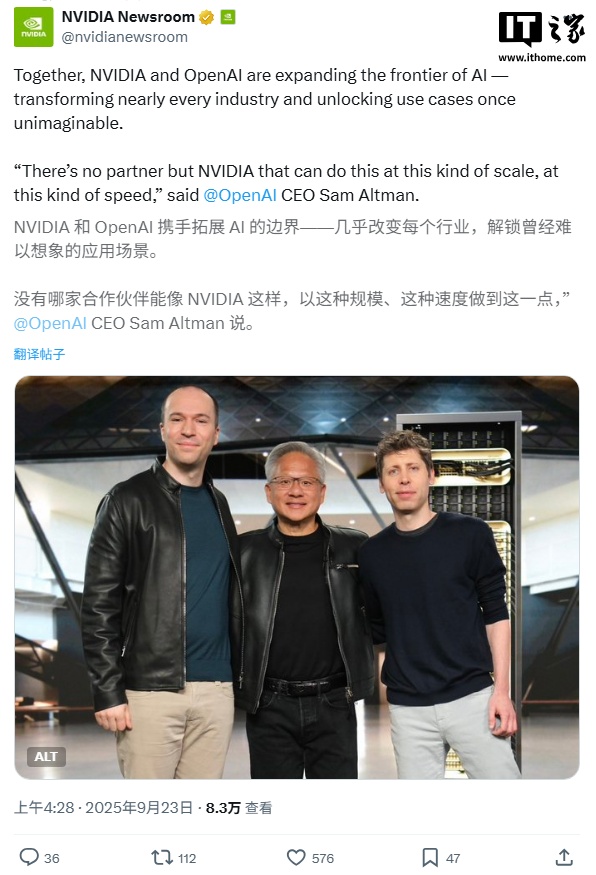 IT之家 9 月 23 日消息,英伟达和 OpenAI 今日发布声明,宣布将展开一项具有里程碑意义的战略合作伙伴关系。双方将在未来几周内敲定该战略合作的具体细节。