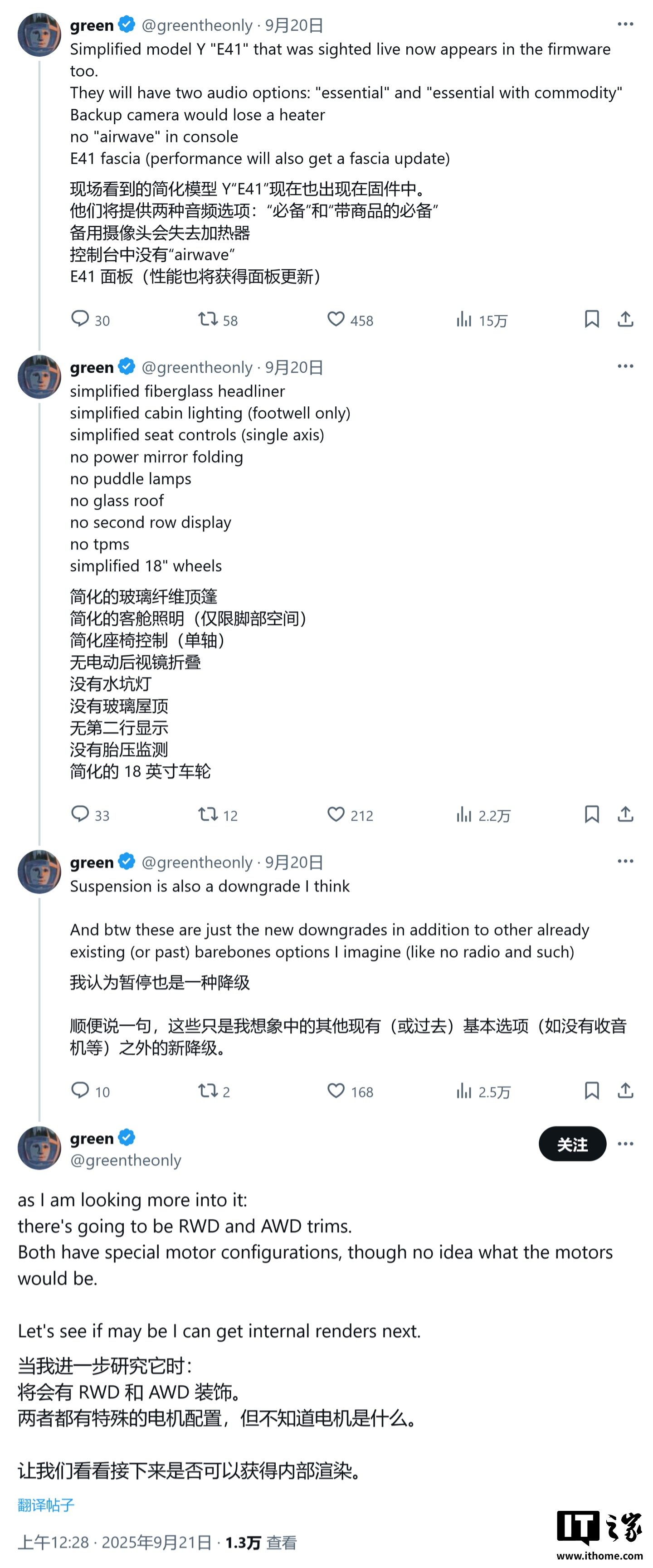 IT之家 9 月 23 日消息,消息源 @greentheonly 于 9 月 20 日在 X 平台发布推文,报道称在特斯拉车载固件中,首次发现了代号“E41”的低价版 Model Y 信息。
