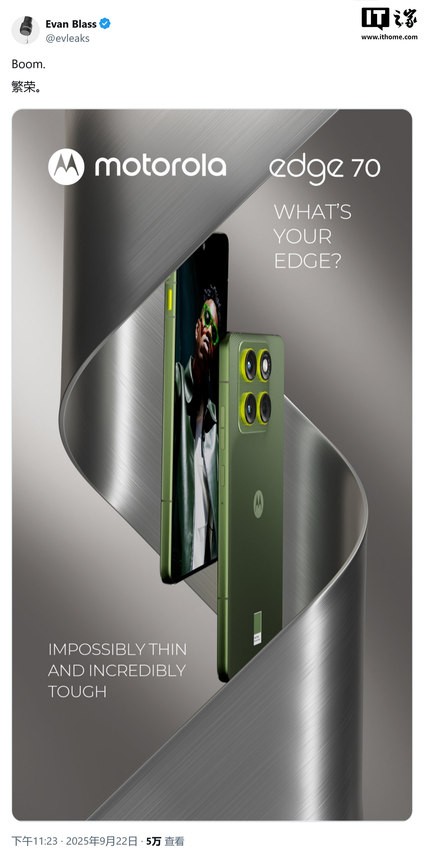 摩托罗拉 Edge 70 手机宣传标语为“极薄且坚固”(Impossibly Thin and Incredibly Tough),预示着 Edge 70 将延续超薄设计,同时具备军规级耐用性,并可能达到双重甚至三重 IP 防护等级。