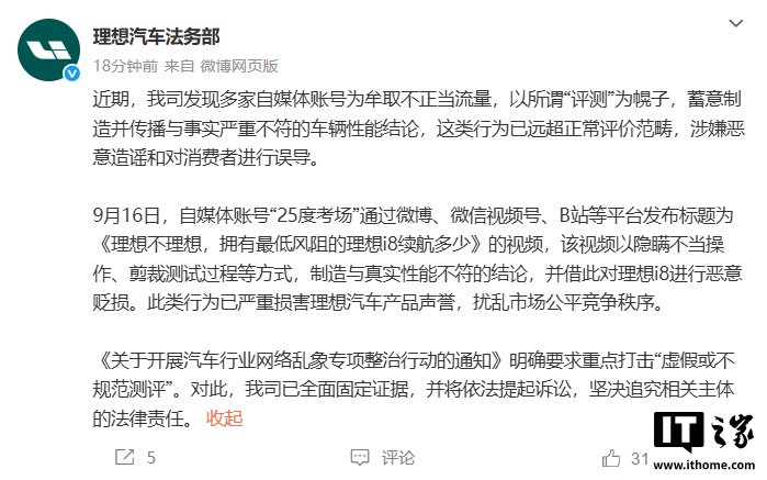 理想汽车法务部称,9 月 16 日,自媒体账号“25 度考场”通过微博、微信视频号、B站等平台发布标题为《理想不理想,拥有最低风阻的理想 i8 续航多少》的视频,该视频以隐瞒不当操作、剪裁测试过程等方式,制造与真实性能不符的结论,并借此对理想 i8 进行恶意贬损。此类行为已严重损害理想汽车产品声誉,扰乱市场公平竞争秩序。