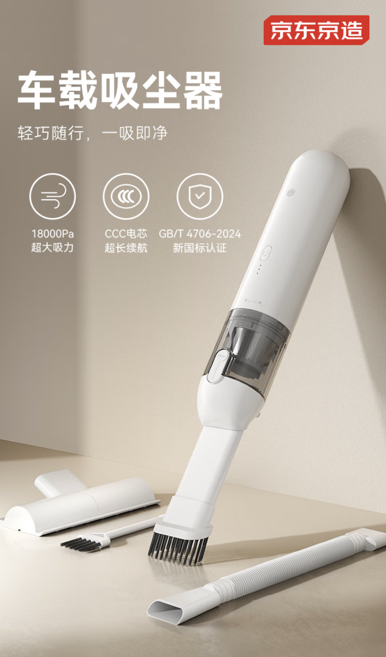 IT之家 9 月 23 日消息,京东京造现已上架一款 18000Pa 车载吸尘器,续航至高 35 分钟,匹配长毛刷、扁毛刷、软管吸嘴,额外赠送 1 个滤芯,定价为 169 元。