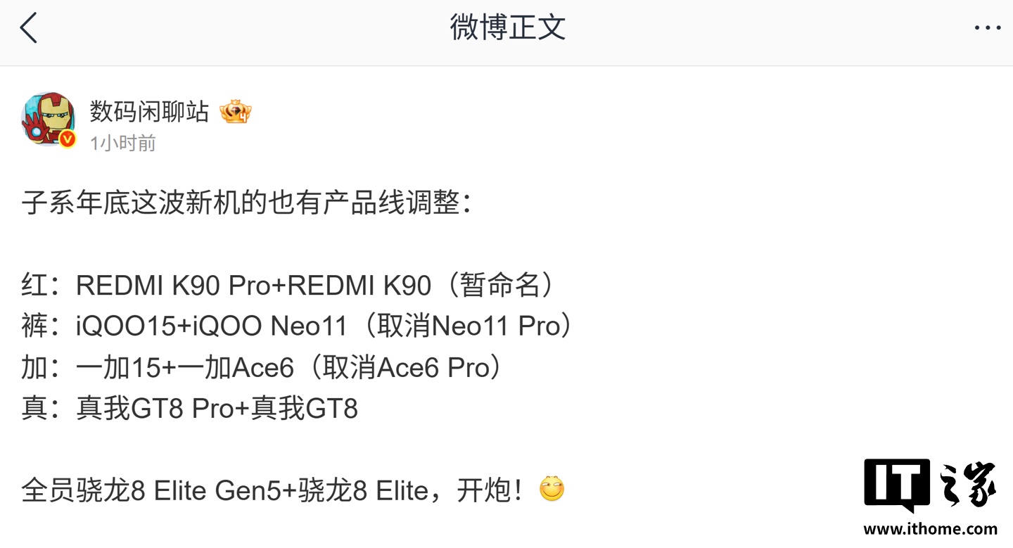 博主还表示,这些子系机型将“全员”上高通骁龙 8 Elite Gen 5、骁龙 8 Elite。